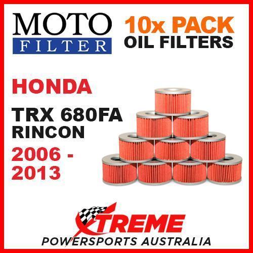 10 PACK MOTO FILTER OIL FILTERS HONDA TRX680FA TRX 680FA RINCON 2006-2013 ATV You are purchasing: Moto Filter 10x Pack of Oil Filters (MFO111BOX) Suits: HONDA TRX 680FA Rincon Years 2006-2013 Specifications: Constructed using the highest quality paper creating a high filtration flow rate. Easy to follow HiFlo / K&N numbering system. To fit Honda TRX 680FA Rincon 2006, 2007, 2008, 2009, 2010, 2011, 2012, 2013 models.