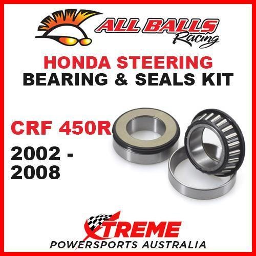 22-1010 MX STEERING HEAD BEARING & SEAL KIT HONDA CRF450R CRF 450R 2002-2008 You are purchasing : All Balls Steering Head Bearing Kit (22-1010) Suits: HONDA CRF 450R Years 2002-2008 Specifications: Designed as a drop-in replacement to upgrade OEM ball-type bearings to taper bearings. Tapered roller bearings provide decreased maintenance along with less wear, smoother operation and longer life. Mix and match bearings / seals for front-end conversions. Kits contain top and bottom bearing assemblies and seals. To fit Honda CRF 450R 2002, 2003, 2004, 2005, 2006, 2007, 2008 models.