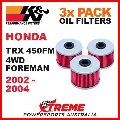 3 PACK K&N OIL FILTERS HONDA TRX450FM TRX 450FM FOREMAN 4x4 2002-2004 ATV KN 113 You are purchasing: 3 Pack K&N Oil Filters (KN- 113 ) K&N delivers a race-spec oil filter that is built with a high-efficiency media specifically designed to be compatible with the high concentrates of synthetic oils. The oversized media provides extra surface area to increase efficiency and lower restriction. The high flow rates and outstanding oil filtration keep your motor running clean and smooth. K&N Oil Filters deliver performance and confidence! Suits: HONDA TRX 450FM Foreman 4x4 Years 2002-2004 Specifications: Premium synthetic blend media provides outstanding filtration at high flow rates. Specifically designed for use with today's synthetic and synthetic-blended oils. Traps 99% of harmful contaminants. To fit Honda TRX 450FM Foreman 4WD 2002, 2003, 2004 models.