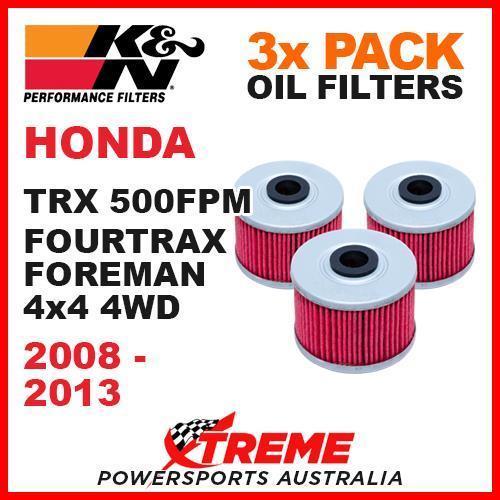3 PACK K&N OIL FILTERS HONDA TRX500FPM 500FPM FOURTRAX FOREMAN 2008-2013 KN 113 You are purchasing: 3 Pack K&N Oil Filters (KN- 113 ) K&N delivers a race-spec oil filter that is built with a high-efficiency media specifically designed to be compatible with the high concentrates of synthetic oils. The oversized media provides extra surface area to increase efficiency and lower restriction. The high flow rates and outstanding oil filtration keep your motor running clean and smooth. K&N Oil Filters deliver performance and confidence! Suits: HONDA TRX 500FPM 4x4 Fourtrax Foreman Years 2008-2013 Specifications: Premium synthetic blend media provides outstanding filtration at high flow rates. Specifically designed for use with today's synthetic and synthetic-blended oils. Traps 99% of harmful contaminants. To fit Honda TRX 500FPM Fourtrax Foreman 4x4 4WD 2008, 2009, 2010, 2011, 2012, 2013 models.