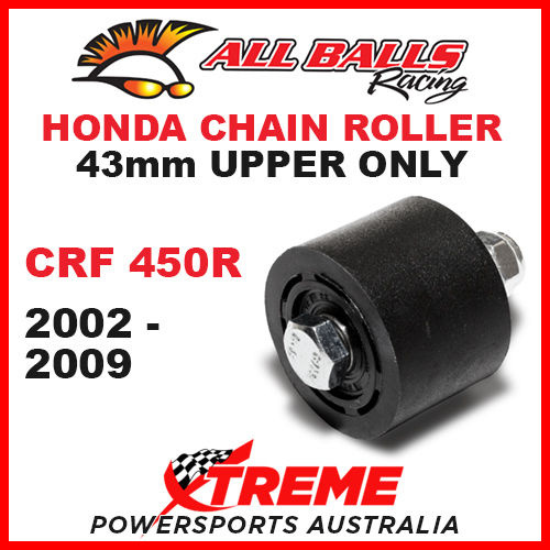 79-5007 MX 43mm UPPER CHAIN ROLLER KIT HONDA CRF450R CRF 450R 2002-2009 DIRTBIKE You are purchasing : All Balls Upper Chain Roller Kit 43mm x 24mm Black (79-5007) Suits: HONDA CRF 450R Years 2002-2009 Specifications: A quality replacement chain roller kit from All Balls Racing. Designed as as direct replacement for the OEM design. 34mm and 38mm rollers feature an outer mechanical seal to protect the bearings from dirt and water and include mounting hardware. To fit Honda CRF 450R 2002, 2003, 2004, 2005, 2006, 2007, 2008, 2009 models.