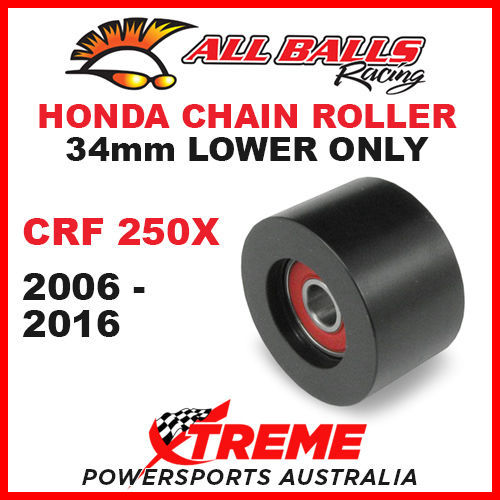 79-5015 MX 34mm LOWER CHAIN ROLLER KIT HONDA CRF250X CRF 250X 2006-2016 DIRTBIKE You are purchasing : All Balls Lower Chain Roller Kit 34mm x 23mm Black (79-5015) Suits: HONDA CRF 250X Years 2006-2016 Specifications: A quality replacement chain roller kit from All Balls Racing. Designed as as direct replacement for the OEM design. 34mm and 38mm rollers feature an outer mechanical seal to protect the bearings from dirt and water and include mounting hardware. To fit Honda CRF 250X 2006, 2007, 2008, 2009, 2010, 2011, 2012, 2013, 2014, 2015, 2016 models.
