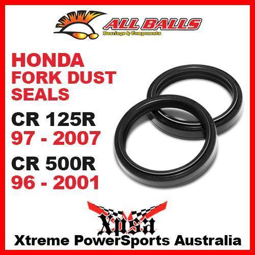 ALL BALLS 57-103 FORK DUST SEALS KIT HONDA CR125R CR 125R 97-2007 CR500R 96-2001 You are purchasing: All Balls Fork Dust Seals Kit 46 x 58.5 x 14.25 (57-103) Suits: HONDA CR 125R Years 1997-2007 CR 500R Years 1996-2001 Specifications: A quality pair of fork dust seals from All Balls Racing. Use these dust seals to keep dirt away from your fork seals, making them last longer. Dust seals feature external garter springs to keep fork tubes clean. Directional ribs allow seals to be installed easily.