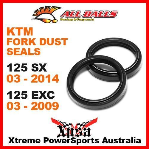 ALL BALLS 57-105 FORK DUST SEALS KTM 125SX 125 SX 03-2014 125EXC EXC 03-2009 MX You are purchasing: All Balls Fork Dust Seals Kit 48 x 58.5 x 12 (57-105) Suits: KTM 125 SX Years 2003-2014 125 EXC Years 2003-2009 Specifications: A quality pair of fork dust seals from All Balls Racing. Use these dust seals to keep dirt away from your fork seals, making them last longer. Dust seals feature external garter springs to keep fork tubes clean. Directional ribs allow seals to be installed easily.