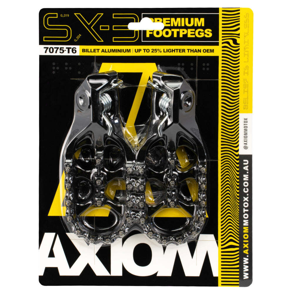 Axiom SX-3 Premium Footpegs set the benchmark when it comes to aluminium footpegs. Precision engineered from 7075-T6 aluminium using the latest manufacturing processes and development input from factory riders, has created an extremely lightweight footpeg that provides the ultimate grip with unrivalled strength.