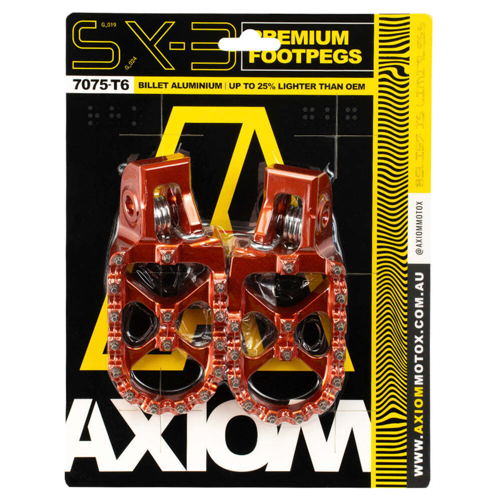 Axiom SX-3 Premium Footpegs set the benchmark when it comes to aluminium footpegs. Precision engineered from 7075-T6 aluminium using the latest manufacturing processes and development input from factory riders, has created an extremely lightweight footpeg that provides the ultimate grip with unrivalled strength.