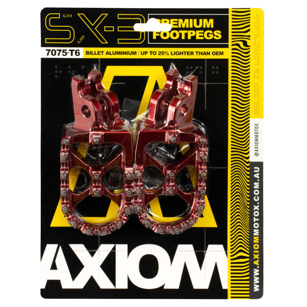 Axiom SX-3 Premium Footpegs set the benchmark when it comes to aluminium footpegs. Precision engineered from 7075-T6 aluminium using the latest manufacturing processes and development input from factory riders, has created an extremely lightweight footpeg that provides the ultimate grip with unrivalled strength.