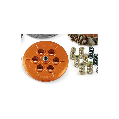 Greatly increases clutch capacity. Provides smoother shifting and multiple spring pressure options. Ideal for stock to highly modified applications. Includes steel hub, billet pressure plate, clutch plates, and multiple spring.