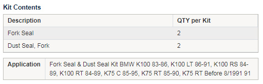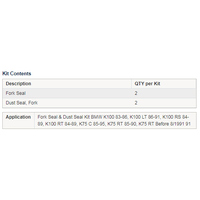 • Kit contains 2x Fork Seals and 2x Dust Seals.