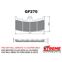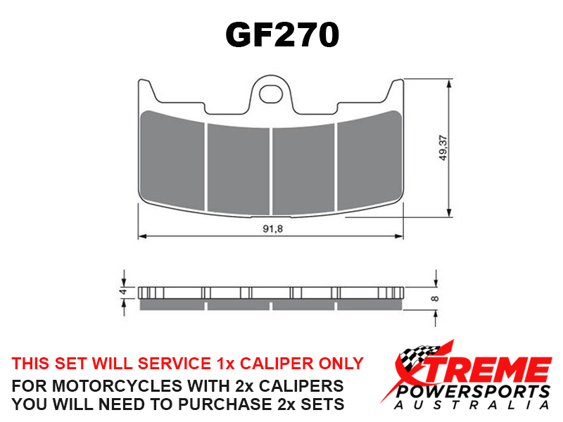 This set of brake pads will service 1x brake caliper only. For motorcycles with 2x brake calipers, you will need to purchase 2x brake pad sets.