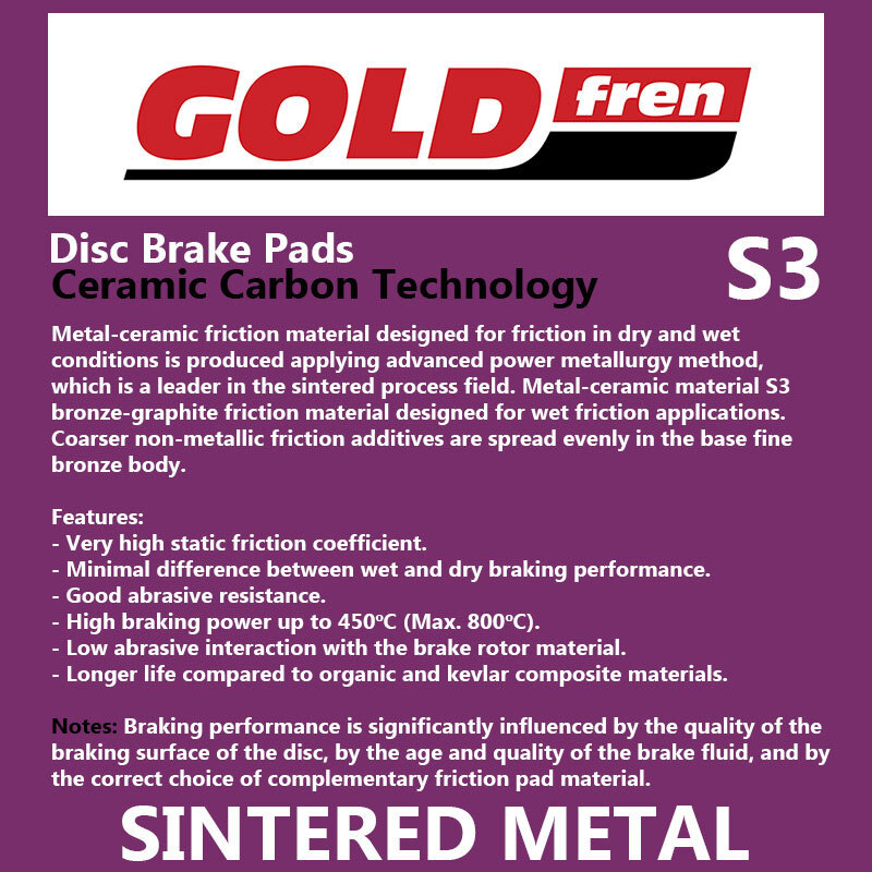 • The S3 sintered compound is optimal for street bikes, dual sport, touring, cruisers. It's recommended on applications with rather larger engines or for people who ride harder than average and want the great stopping power of a sintered brake pad.
