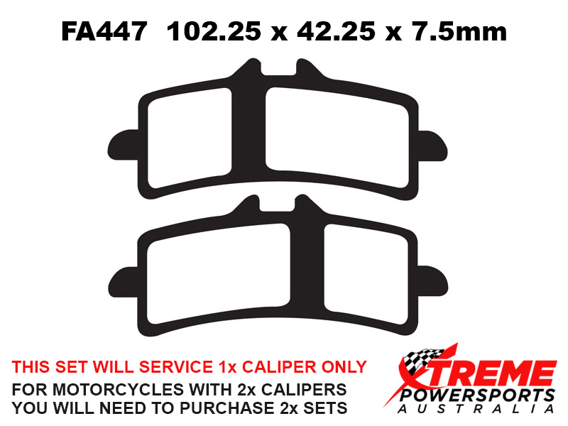 This set of brake pads will service 1x brake caliper only. For motorcycles with 2x brake calipers, you will need to purchase 2x brake pad sets.
