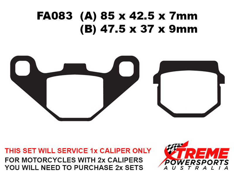 This set of brake pads will service 1x brake caliper only. For motorcycles with 2x brake calipers, you will need to purchase 2x brake pad sets.