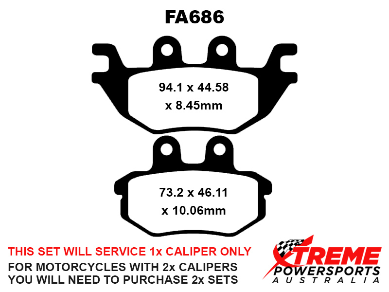 This set of brake pads will service 1x brake caliper only. For motorcycles with 2x brake calipers, you will need to purchase 2x brake pad sets.
