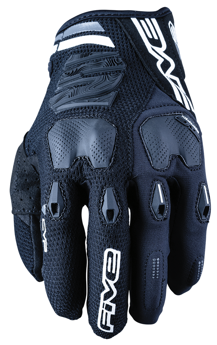 This is what were talking about with the dual-shell ERGO PROTECH® in soft TPR, whichll protect you from tree trunks or rocks, but is also nearly undetectable when youre at the controls. Weve really focused on ventilation, with mesh fabric on the inner half of the hand, while weve kept the tougher materials on the outer half thats more exposed to all kinds of contact (with trees, thorns, rocks, etc.). And since Enduro means you spend long hours at the controls, navigational contact has to be comfortable. The E2 is thus equipped with a palm in AX Suede® Novobuck, a material that provides excellent grip and is both durable and comfortable, along with 2 mm foam rubber pads on the palms and 3 mm on the thumbs. You get the picture: with the E2, FIVE offers an Enduro-specific glove thats bound to set the standard...