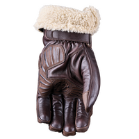 FIVE has thought of everyone who wants to ride in comfort despite the cold, and in style, at the controls of a motorcycle full of personality, and weve been inspired by 1930s flight jackets, from a time when aviators needed to spend hours in a freezing cockpit, wearing warm, durable garments. The Montana will delight you, first with its quality, and the suppleness and toughness of its full-grain cowhide leather, specially selected and coated for a truly authentic look that covers the back of the hand and the palm. But the most impressive thing here is the feeling of warmth and comfort when you wear it, thanks to its synthetic sheepskin lining around the wrist, and the polar-fleece internal lining throughout the hand, all the way down to the fingertips. There are two ways to wear the Montana: with the cuff rolled up or rolled down. The rolled-up position, which highlights the sheepskin-style lining, is secured with two snaps. And you simply need to fold the cuff down for it to cover or slip into your jacket, as you wish...or in case theres an unexpected rain shower.