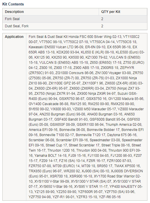 • Kit contains 2x Fork Seals and 2x Dust Seals.
