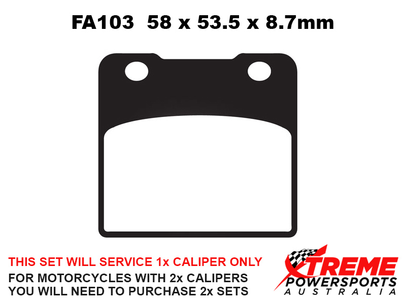 This set of brake pads will service 1x brake caliper only. For motorcycles with 2x brake calipers, you will need to purchase 2x brake pad sets.