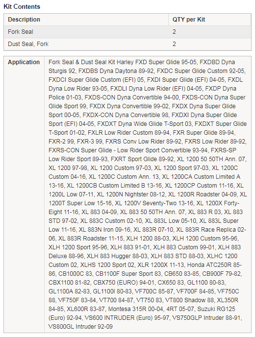 • Kit contains 2x Fork Seals and 2x Dust Seals.