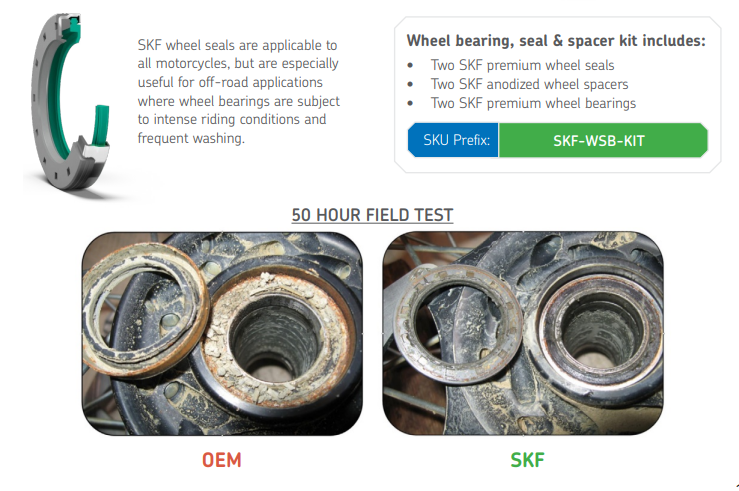 SKF utilizes decades of bearing sealing experience to provide solutions that gives the ultimate riding experience with reduced friction, increased service intervals and longer bearing life. The Wheel Seal Kit also includes SKF bearings.