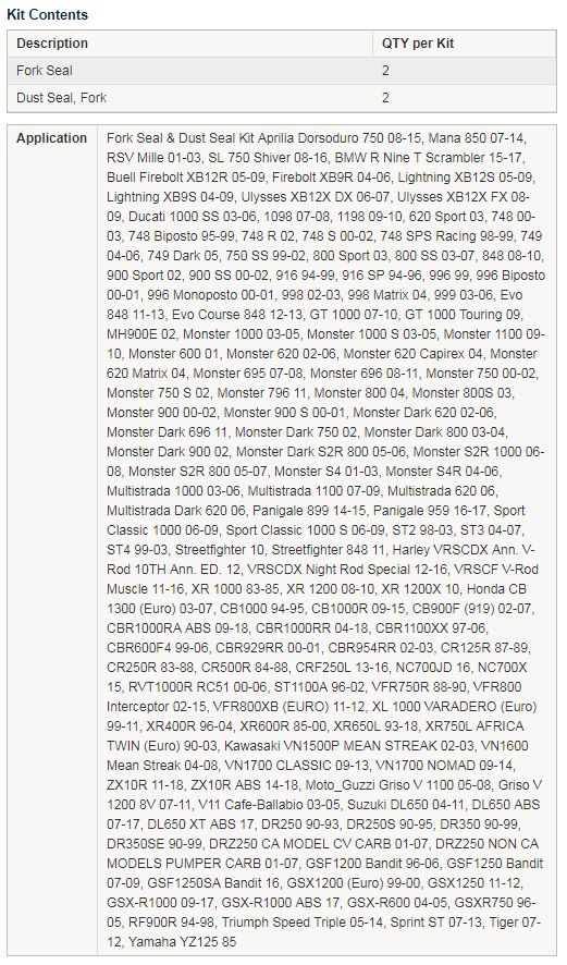 • Kit contains 2x Fork Seals and 2x Dust Seals.