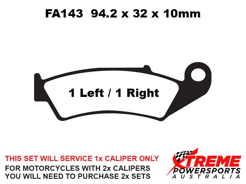 This set of brake pads will service 1x brake caliper only. For motorcycles with 2x brake calipers, you will need to purchase 2x brake pad sets.