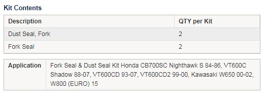 • Kit contains 2x Fork Seals and 2x Dust Seals.