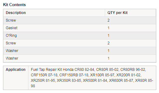• Fuel tap rebuild kits are intended to be used to repair one fuel tap only.