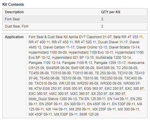 • Kit contains 2x Fork Seals and 2x Dust Seals.