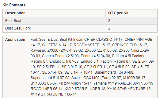 • Kit contains 2x Fork Seals and 2x Dust Seals.