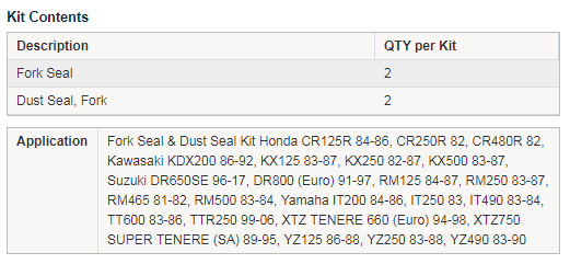 • Kit contains 2x Fork Seals and 2x Dust Seals.