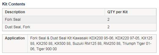 • Kit contains 2x Fork Seals and 2x Dust Seals.