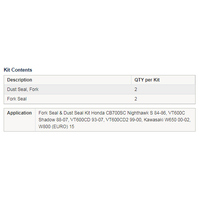 • Kit contains 2x Fork Seals and 2x Dust Seals.