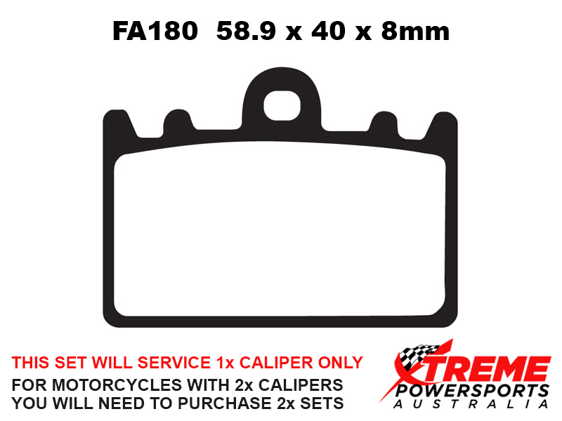 This set of brake pads will service 1x brake caliper only. For motorcycles with 2x brake calipers, you will need to purchase 2x brake pad sets.
