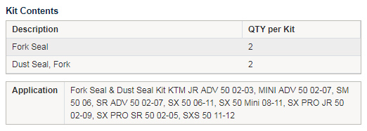 • Kit contains 2x Fork Seals and 2x Dust Seals.