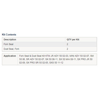 • Kit contains 2x Fork Seals and 2x Dust Seals.