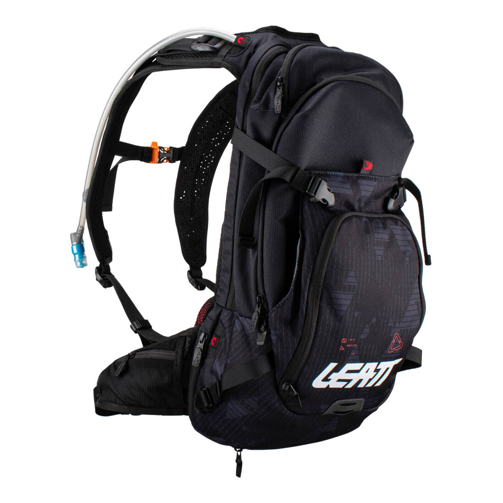 Leatt uses a vertical HydraPak high-flow bladder with an auto shut-off bite valve feed tube routing can be either over the shoulder or under the arm. If you’re looking for impact protection for your back there is an option to purchase a CE impact-tested and certified insert a handy Hi-Viz rain cover is included should the heavens open to keep the bag dry. One size fits all!
