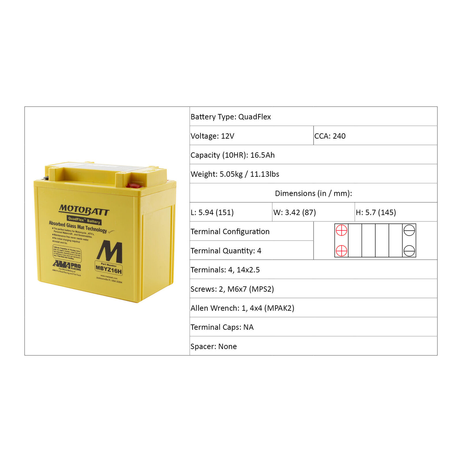 Motobatt batteries are manufactured from Absorbed Glass Mat (AGM) this design has revolutionised the motorcycle ATV lawnmower and small engine industry. QuadFlex provides a unique four-terminal design with two positives two negatives along with height spacers that permit an almost universal fit. All Motobatt AGM Batteries are maintenance-free non-hazardous non-spill charged and ready to install directly out of the box.