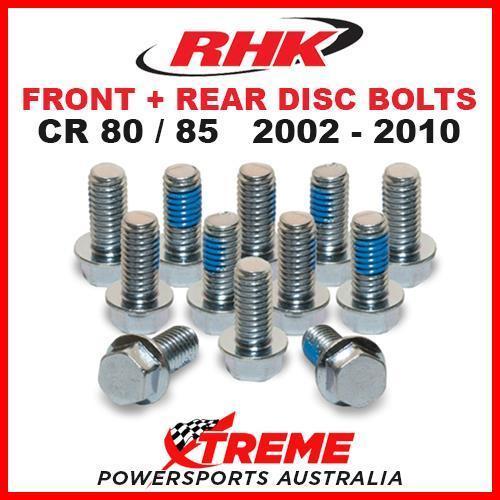 RHK FRONT + REAR HEAVY DUTY BRAKE DISC BOLT SET HONDA CR80 CR85 CR 80 85 02-2010 You are purchasing : RHK Front + Rear Heavy Duty Disc Bolt Set (RHK-DB6) Suits: HONDA CR 80 / CR 85 Years 2002-2010 Specifications: Direct replacement for OEM bolts or used with new wheels. Made from high grade boron steel. Zinc plated. To fit Honda CR 80 / CR 85 2002, 2003, 2004, 2005, 2006, 2007, 2008, 2009, 2010 models.
