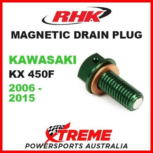 RHK MX MAGNETIC SUMP DRAIN PLUG GREEN KAWASAKI KXF 450 KX 450F KX450F 2006-2015 You are purchasing: RHK Magnetic Sump / Drain Plug - Green (RHK-MDP03-E) Suits: KAWASAKI KX 450F Years 2006-2015 Specifications: Powerful magnet installed in drain plug to catch and hold metal particles includes copper ring for perfect sealing. CNC machined from 6061-T6 aluminium.