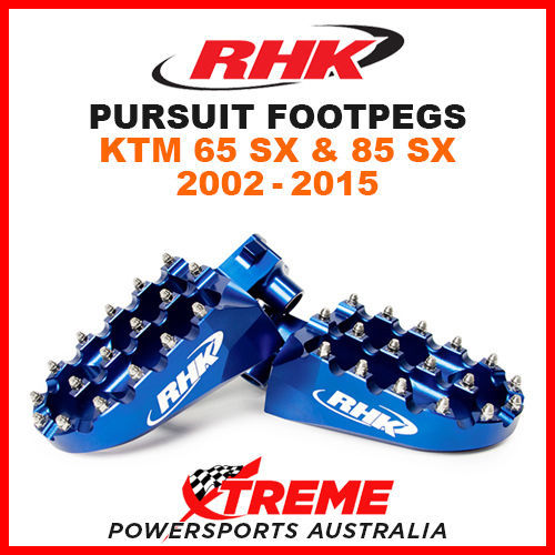 RHK MX BLUE ALLOY PURSUIT FOOTPEGS KTM 65SX 85SX SX65 SX85 SX 65 85 2002-2015 You are purchasing: RHK Alloy Pursuit Footpegs - Blue (RHK-F03-B) Suits: KTM 65 SX / 85 SX Years 2002-2015 Specifications: The Forged Advantage – 7075-T6 billet aluminium is shaped during the forging process to form the foot peg. Forging – refines the internal grain of the aluminium to remove imperfections and produces a continuous grain with unrivalled strength. Lightweight cut-outs give an aerodynamic design which reduces excess mud build-up. Unique triple-bridge design allows for 17 teeth across 3 rows for increased grip. Fitted with super aggressive, high-tempered steel teeth for exceptional grip. 57mm wide oversize footpegs for extra stability. Extremely lightweight – designed for racing. Includes an optional standard grip teeth set and spare replaceable super aggressive teeth.