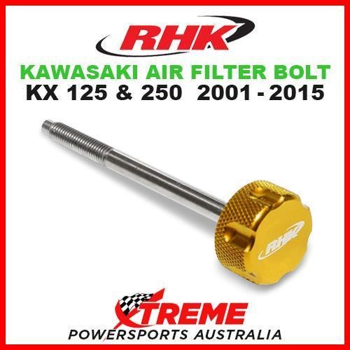 RHK MX GOLD AIR FILTER BOLT MOTO KAWASAKI KX125 KX250 KX 125 250 2001-2015 DIRT You are purchasing: RHK Air Filter Bolt - Gold (RHK-AFB03-G) Suits: KAWASAKI KX 125 / KX 250 Years 2001-2015 Specifications: Q uick release air filter bolt. Stainless steel shaft - no rust. Head machined from 6061-T6 alloy.