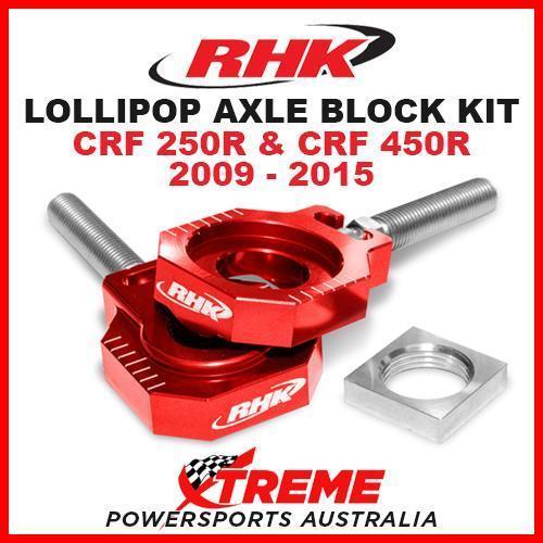 RHK MX LOLLIPOP AXLE BLOCK KIT RED HONDA CRF250R CRF450R CRF 250R 450R 2009-2015 You are purchasing : RHK Lollipop Axle Block - Red (RHK-AB23-R) Suits: HONDA CRF 250R Years 2009-2015 CRF 450R Years 2009-2015 Specifications: RHK lollipop axle blocks have specially connected bolts to keep the axle stable in swing arm for easy gearing changes. CNC machined from 6061-T6 aluminium. Laser etched line markers.