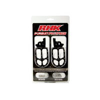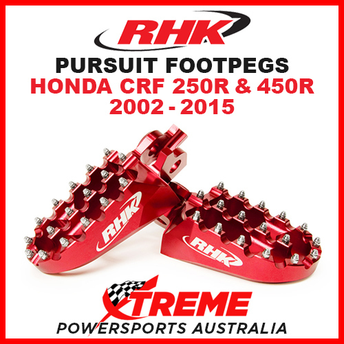 RHK MX RED ALLOY PURSUIT FOOTPEGS HONDA CRF250R CRF450R CRF 250R 450R 02-2015You are purchasing : RHK Alloy Pursuit Footpegs - Red (RHK-F01-R) Suits: HONDA CRF 250RYears 2002-2015 CRF 450RYears 2002-2015 Specifications: The Forged Advantage – 7075-T6 billet aluminium is shaped during the forging process to form the foot peg. Forging – refines the internal grain of the aluminium to remove imperfections and produces a continuous grain with unrivalled strength. Lightweight cut-outs give an aerodynamic design which reduces excess mud build-up. Unique triple-bridge design allows for 17 teeth across 3 rows for increased grip. Fitted with super aggressive, high-tempered steel teeth for exceptional grip. 57mm wide oversize footpegs for extra stability. Extremely lightweight – designed for racing. Includes an optional standard grip teeth set and spare replaceable super aggressive teeth.