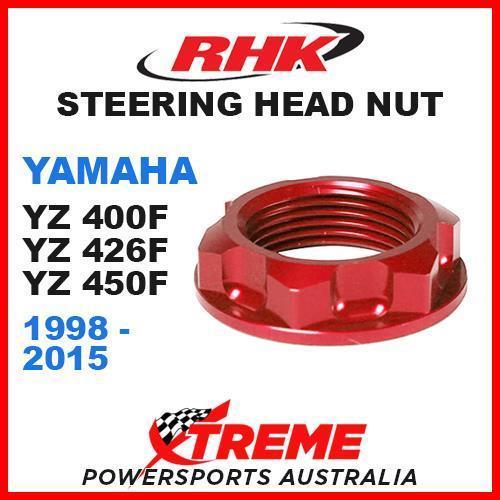RHK MX STEERING HEAD STEM NUT RED YAMAHA YZF YZ YZ400F YZ426F YZ450F 98-2015 You are purchasing : RHK Steering Head Stem Nut - Red (RHK-SN2-R) Suits: YAMAHA YZ 400F Years 1998-1999 YZ 400F Years 2000-2002 YZ 450F Years 2003-2015 Specifications: Lightweight washer-less design. Easier maintenance. CNC machined from 7075-T6 aluminium.