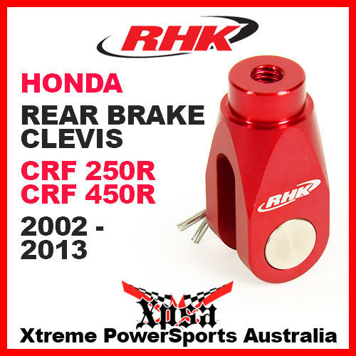 Increase traffic to your listing with Auctiva's FREE Scrolling Gallery.RHK OEM REPLACEMENT BILLET REAR BRAKE CLEVIS RED HONDA CRF250R CRF450R 2002-2013 You are purchasing : RHK Billet Rear Brake Clevis - Red (RHK-BBC01-R) Suits: HONDA CRF 250R Years 2002-2013 CRF 450R Years 2002-2013 Specifications: RHK billet brake clevis eliminates unnecessary movement in OEM brake pedals. CNC machined from 6061-T6 aluminium. Fitted with stainless steel pin and bush. Shot peened anodized aluminium.