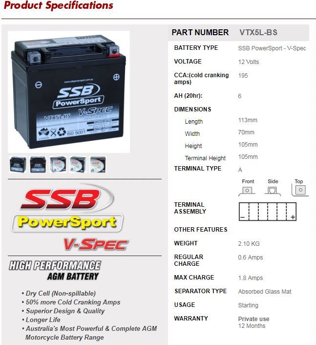 SSB Powersport V-Spec Battery (VTX5L-BS)