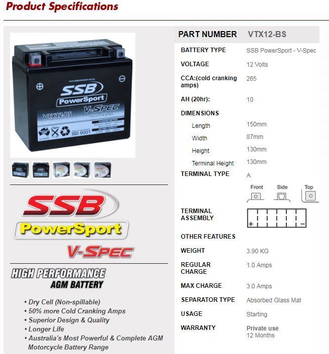 SSB Powersport V-Spec Battery (VTX12-BS)