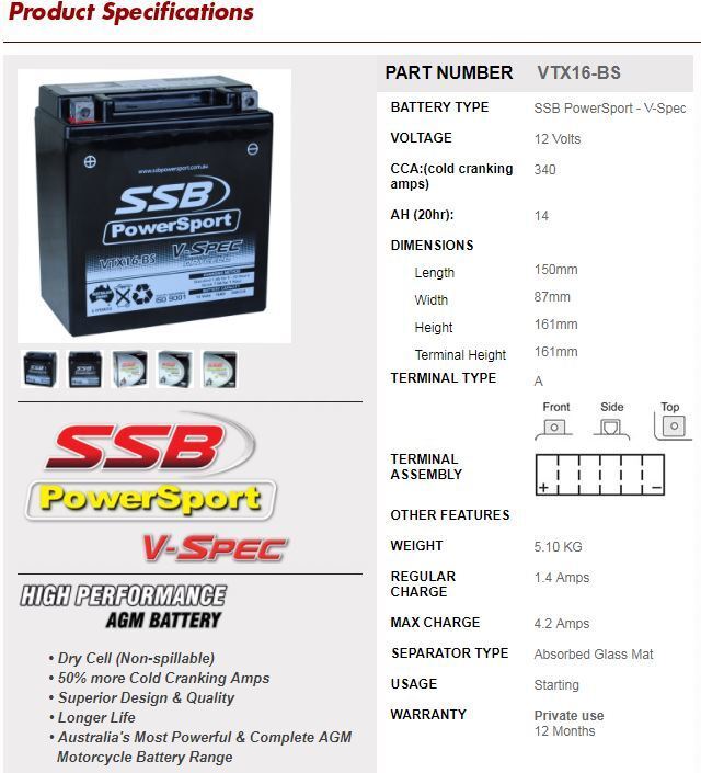 SSB Powersport V-Spec Battery (VTX16-BS)