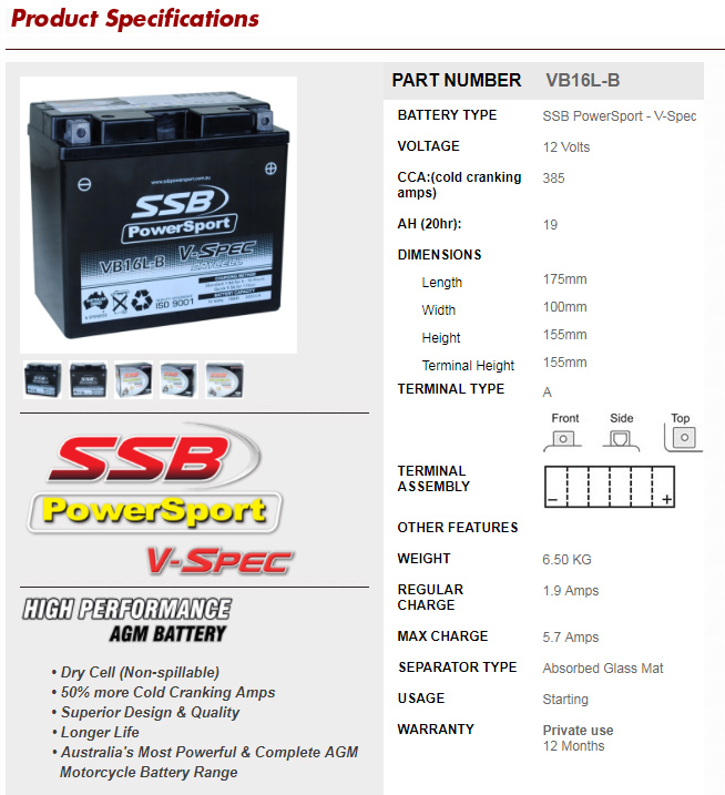 SSB Powersport V-Spec Battery (VB16L-B)
